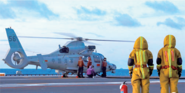 山东舰上损管消防队员在进行直升机加油保险。史新荣 摄